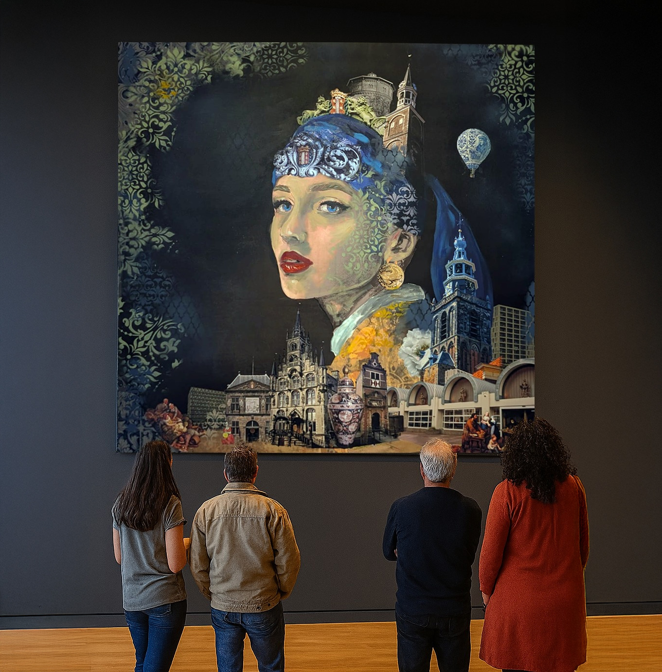 In dit kunstwerk komen twee iconen samen in één krachtig beeld. Aan de ene kant het tijdloze meisje met de parel en aan de andere kant de stad van kaas, ambacht en geschiedenis. Haar blik, verstild maar krachtig, kijkt in rust over Gouda uit. Alsof Vermeer haar even liet opstaan om over de straten van Gouda te waken. Zou dit meisje van Vermeer ooit de Goudse kaas geproefd hebben?