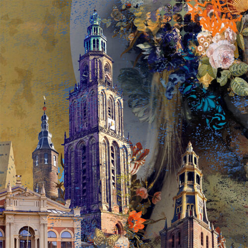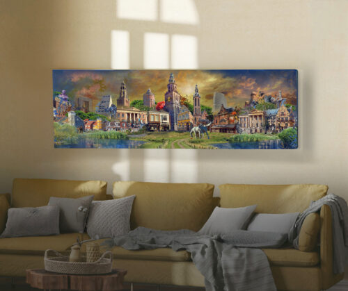 Dit werk vangt de ziel van de stad: de Martinitoren die alles overziet, het Forum, een Groninger Tjalk, de befaamde eierbal en de levendige sfeer van de studentenstad, allemaal samengebracht in een eigentijdse compositie met subtiele details die het karakter van Groningen weerspiegelen.
