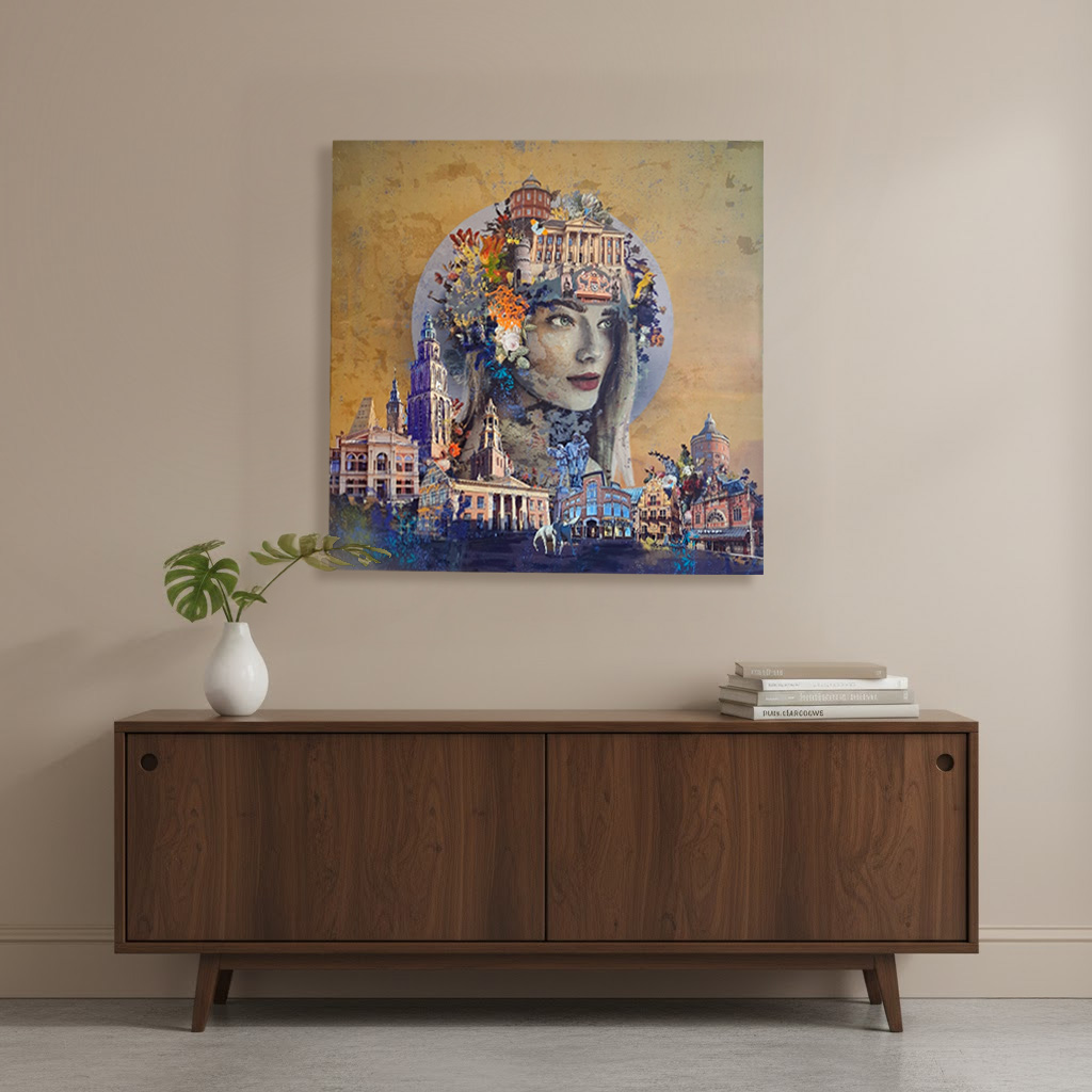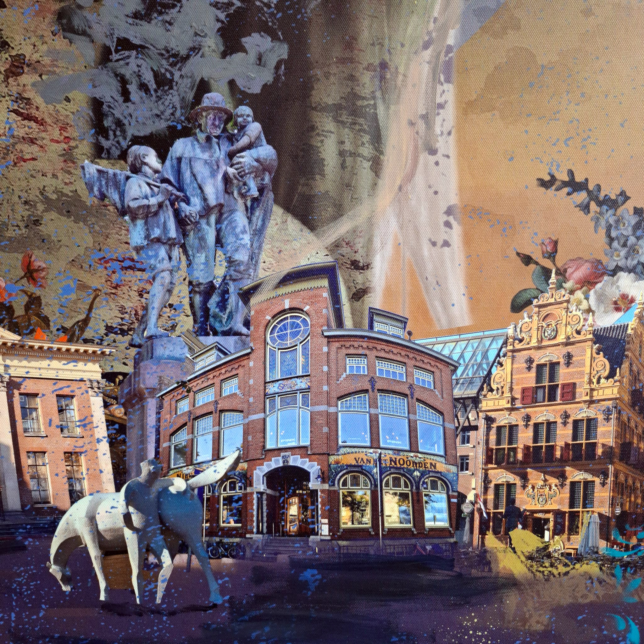 Ontdek de ziel van Groningen in dit unieke, limited edition kunstwerk. Met de trotse Martinitoren, het bruisende Forum, Peerd van Ome Loek en de iconische eierbal vangt dit werk de essentie van de stad. Elk detail is zorgvuldig samengesteld in artprint van het origineel (het origineel is gemaakt in een eigentijdse compositie, met een mix van collage, spuitbus en acrylverf) op hoogwaardig canvas (4 cm diep).